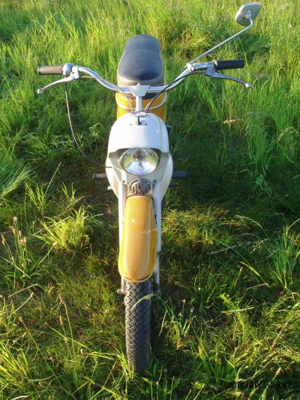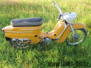 Přechodové provedení. Novější typ řídítek, přední vidlice bez prachovek (s okroužky a chromovanými kluzáky), absence linkování, nápis Jawa 21 + piktogramy u benzínového uzávěru černou barvou.