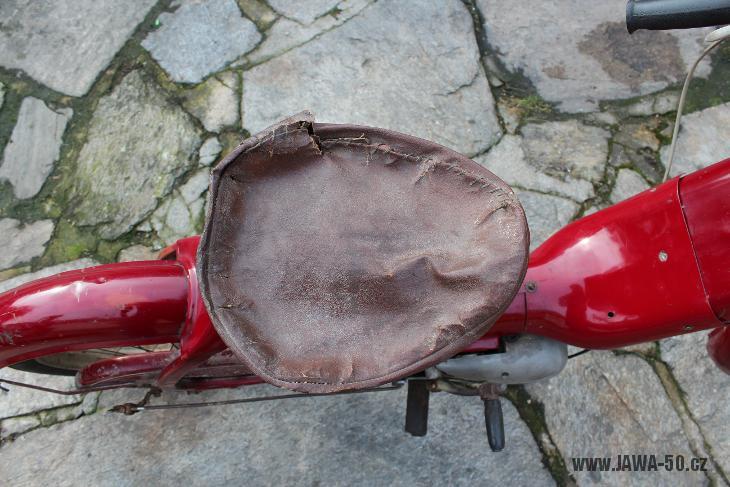Dobová úprava: přizpůsobený nosič zavazadel z většího motocyklu Jawa „pérák“. Dobová koženková brašna.